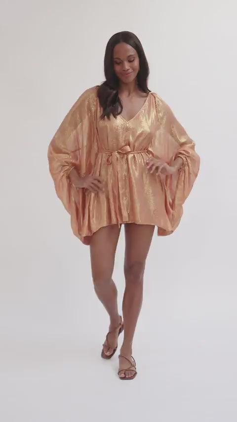 Elina est une robe caftan dont le tissu est joliment souligné de lignes de fils brillants. Les manches chauve-souris se resserrent aux poignets par un élastique. Elle est sublimée d’une encolure V et d’un profond décolleté dans le dos qui s’ajustent grâce à des liens. Une ceinture séparée souligne votre taille selon vos envies.